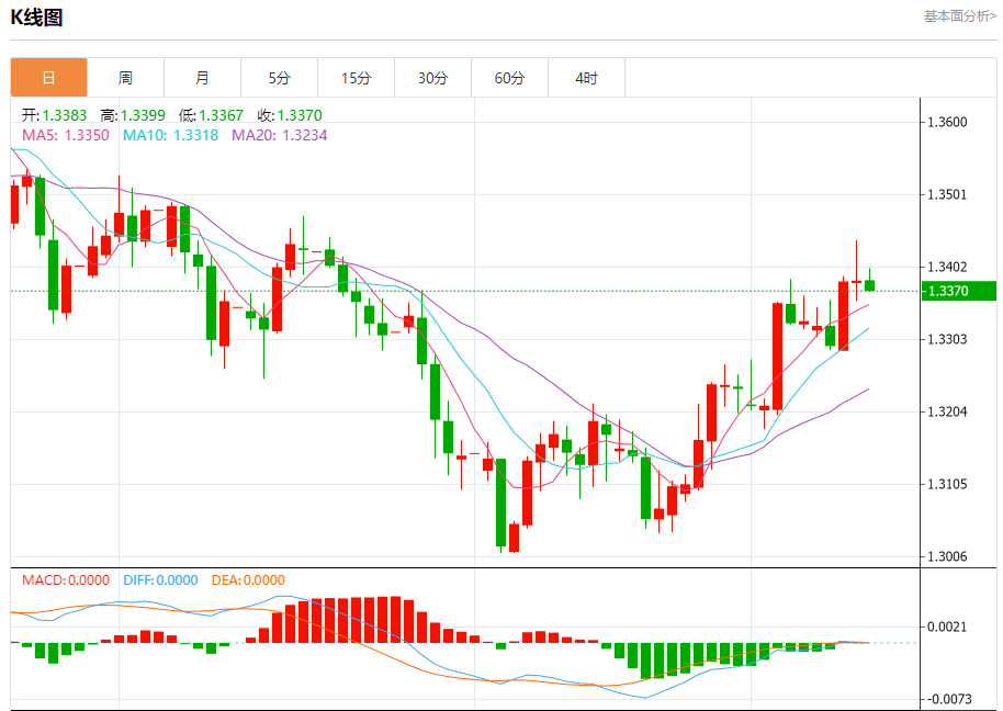 汇价高见1.3399,低见1.3366。上一交易日,汇价收于1.3382。