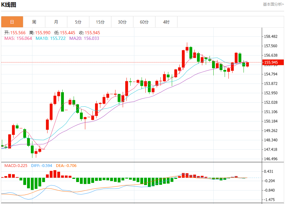 汇价高见155.981,低见155.433。上一交易日,汇价收于155.573。