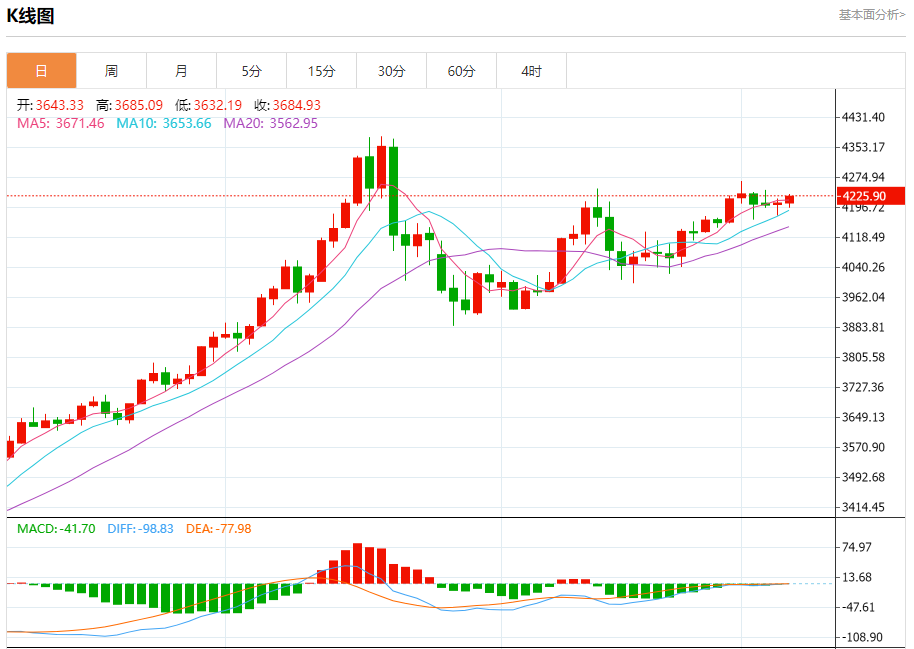 晚间核心阻力聚焦4210-4230美元区间,该区域既是日内反弹高点,也是昨日震荡中枢,叠加小时线MA60均线压制,空头抛压集中;下方支撑重点关注4170-4180美元,此位置对应日内低点与前期震荡平台上沿的重合区域,同时贴合黄金分割0.618关键位,支撑韧性较强。若失守4170美元,下一支撑将指向4160美元的10日均线位置,此处是短期趋势的关键防守线。